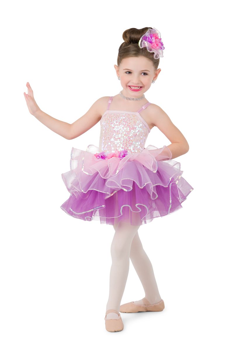 Iridescent sequin over ice pink spandex leotard with adjustable straps. Attached multi-colored tiered tricot tutu. Floral and iridescent sequin trim. Imported.