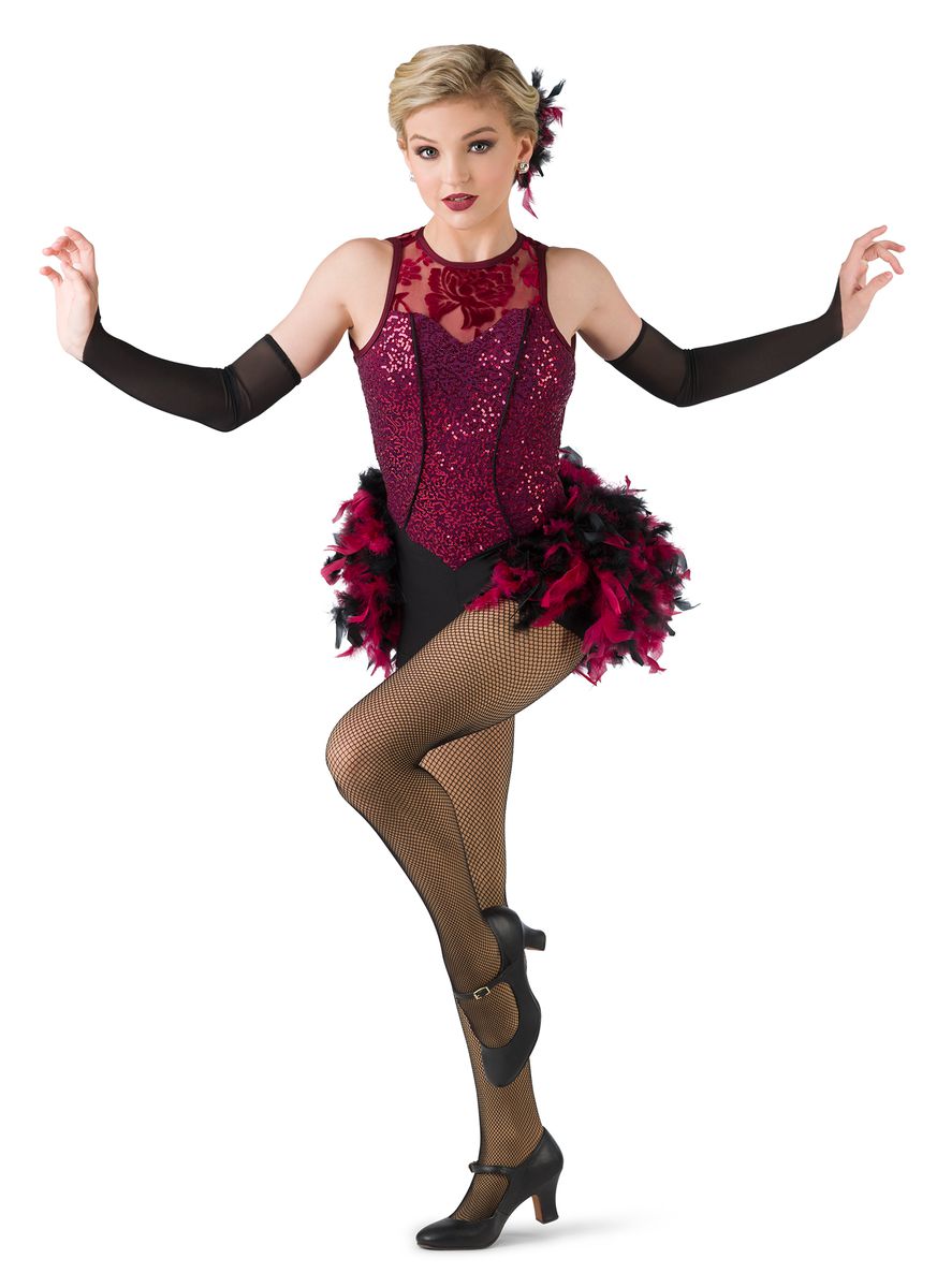 Burgundy burnout velour and sequin silky stretch over burgundy and black spandex shortie unitard with open back detail. Attached multi-colored feather bustle. Piping and binding trim. Made in the USA / Imported.
