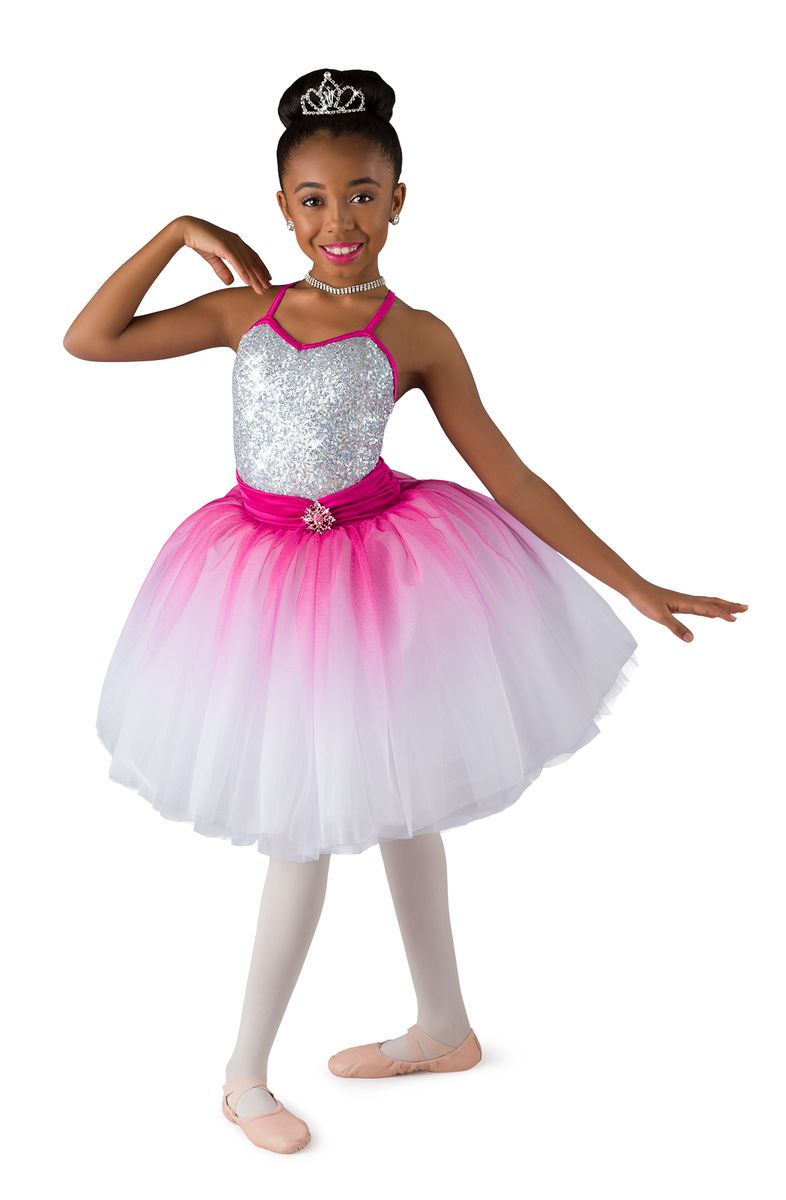 Hologram sequin mesh over white spandex leotard with attached magenta spandex sash. Attached ombré mesh top skirt over white tulle euro tutu. Binding and jewel brooch trim. Made in the USA / Imported.