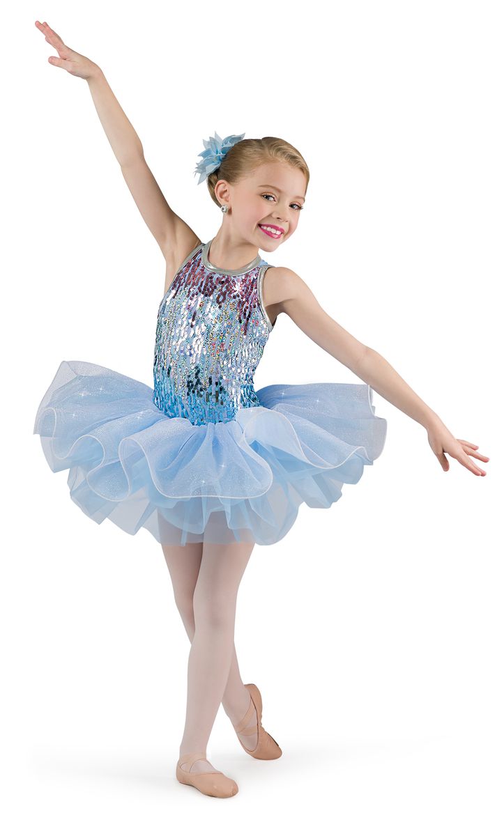 Ombré spangle sequin mesh over copen and white spandex leotard. Separate glitter tulle over copen tricot tutu with curly hem AND white fringe skirt. Sequin and foil binding trim. Imported.
