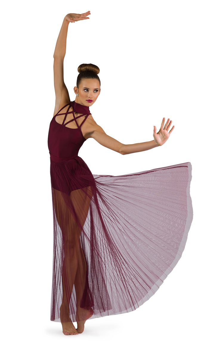 Burgundy spandex brief-cut leotard with strapping detail. Separate burgundy pleated mesh skirt with elastic waistband. Imported.