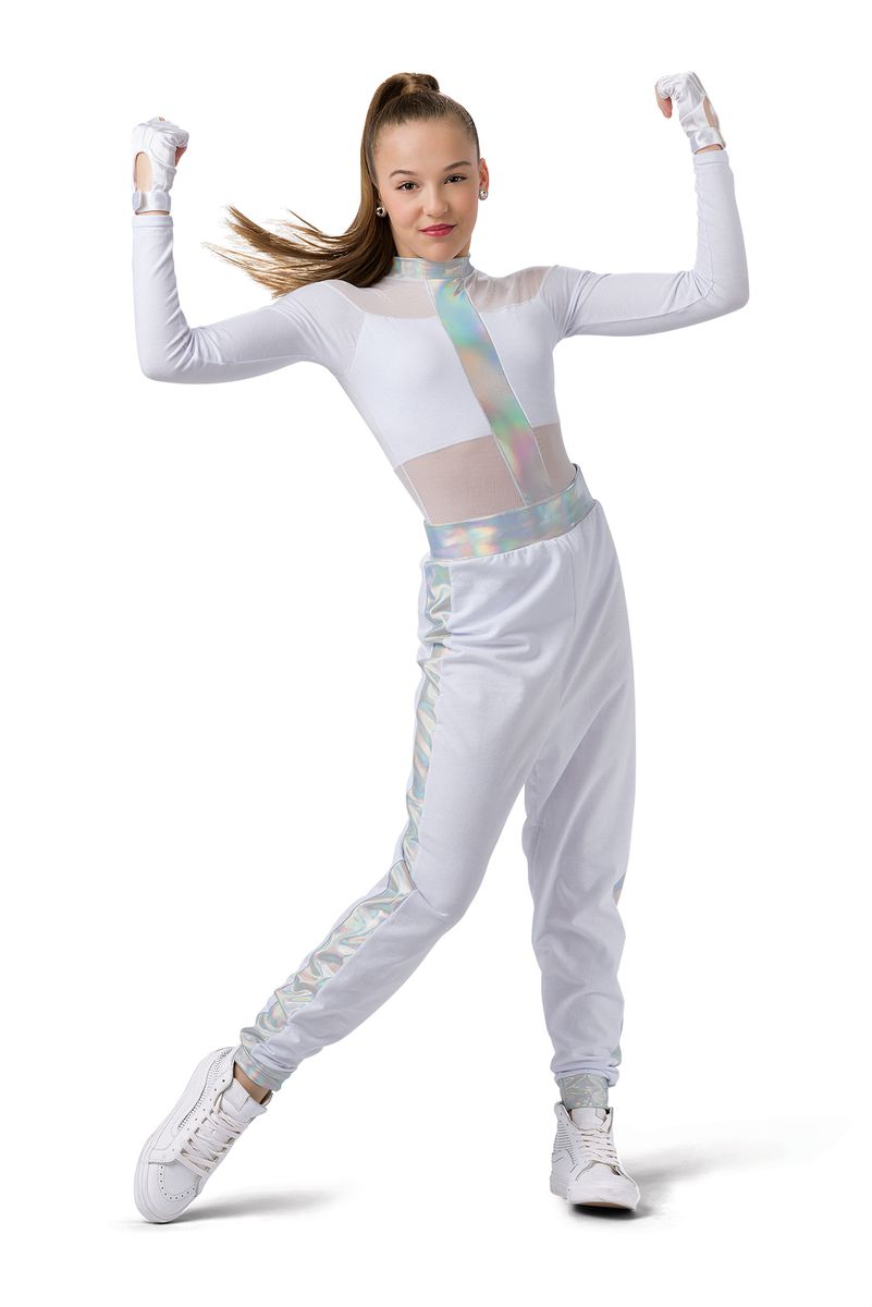 White stretch cotton and laser foil fully lined leotard with white mesh insets. Separate white stretch cotton drop crotch jogger with laser foil inset and elastic waistband. Made in the USA / Imported.