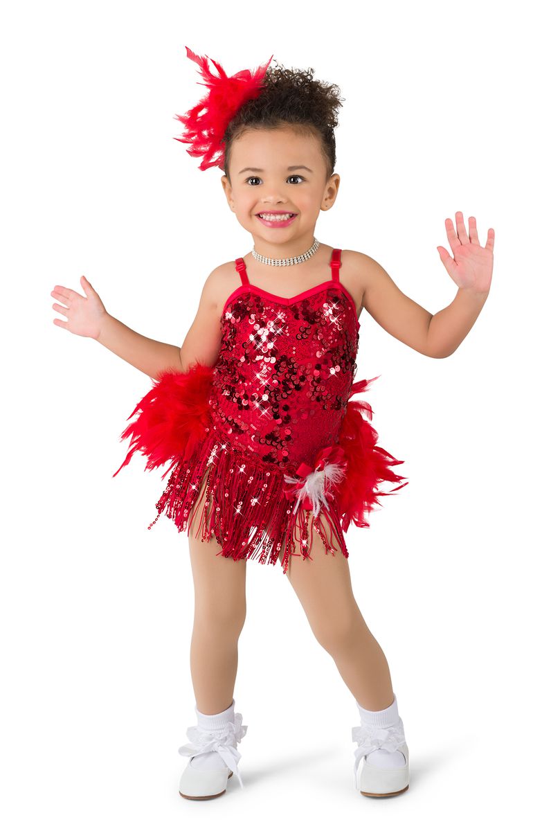 Red sequin silky stretch over red spandex leotard with adjustable straps. Separate red tricot over glitter tulle tutu AND fringe skirt. Beadette and sequin trim. Imported. Boa headpiece and feather brooch accessory included