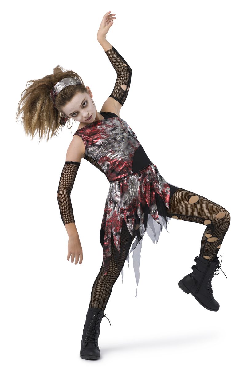 Red and silver printed foil over black spandex and fishnet mesh unitard. Separate foil and black soft tricot skirt. Made in the USA.