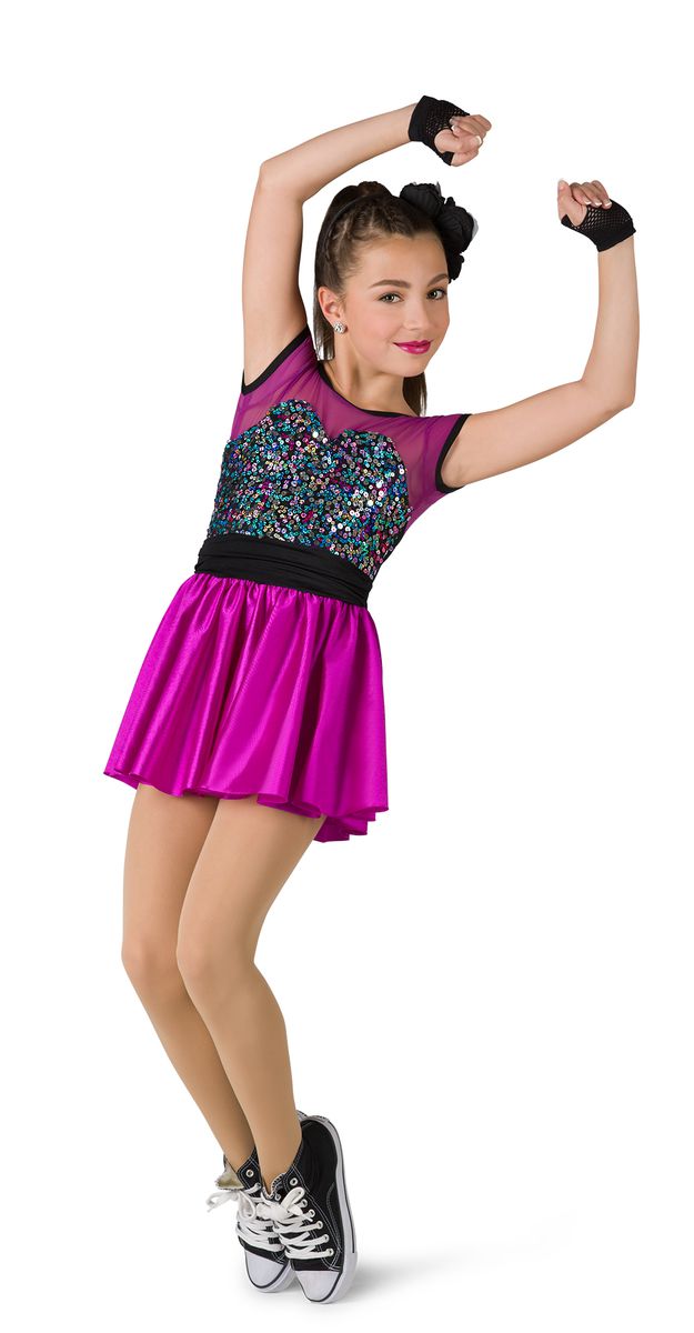 Multi sequin silky stretch and fuchsia mesh over spandex leotard. Attached black spandex sash and fuchsia sateen skirt. Binding trim. Made in the USA.