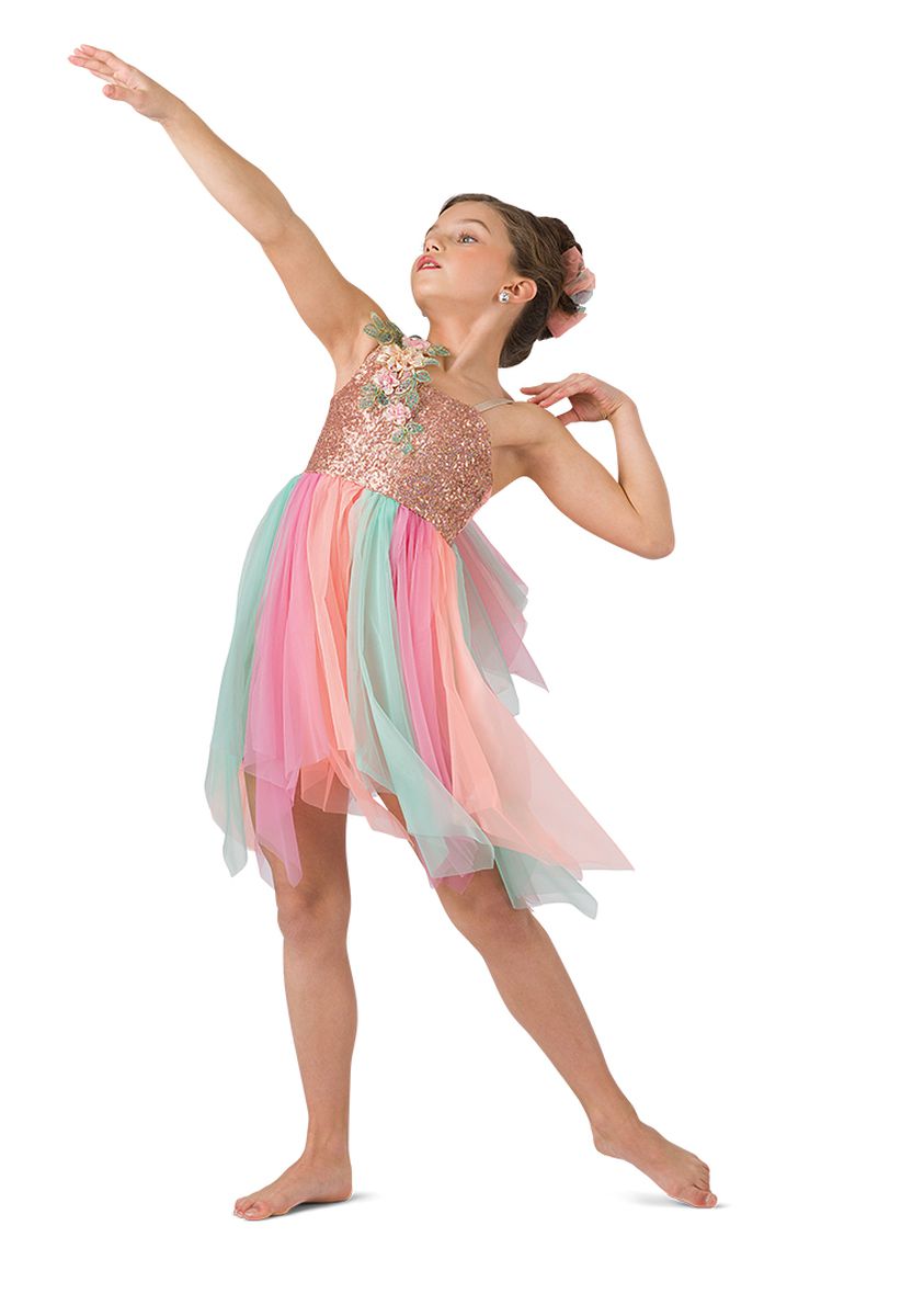 Hologram sequin mesh over apricot spandex leotard with attached multi-colored soft tricot panel skirt and shoulder drape. Appliqué trim. Made in the USA / Imported.